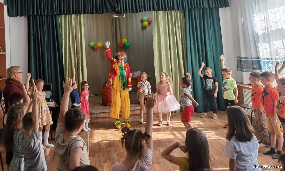 К детям на праздник пришёл весёлый клоун. Он протестировал детей заданиями, для выполнения которых потребовались знания, полученные ребятами на протяжении учебного года. Это разгадывание загадок, складывание из букв слова, узнавание по аудиозаписям голосов животных и птиц, дети говорили, как зовут детёнышей у животных и много других конкурсов и игр. Не забыл клоун поздравить и майских именинников, вручив им шоколадные батончики.