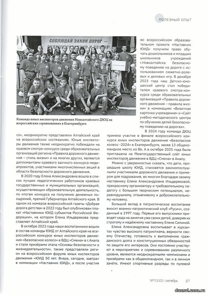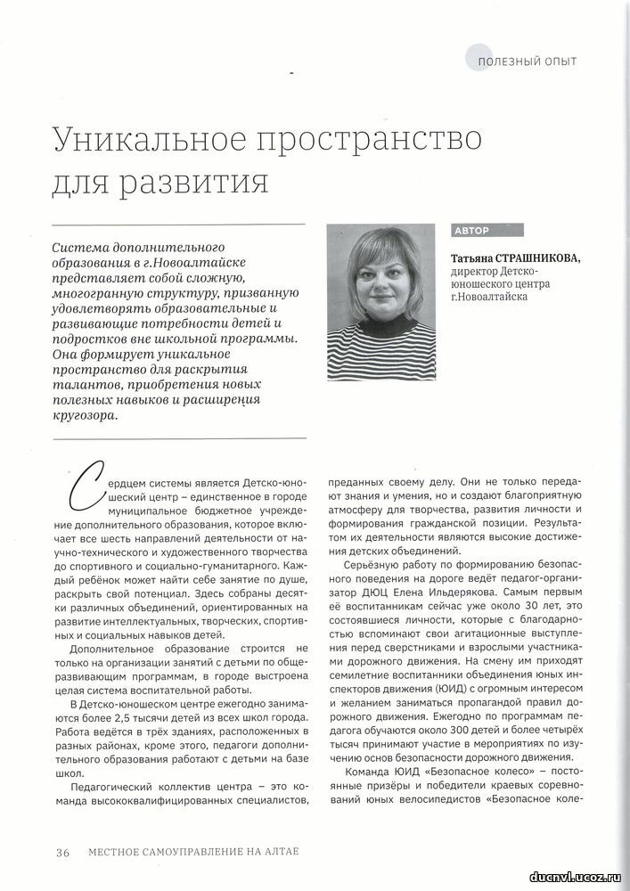 В свет вышел новый выпуск краевого информационно-аналитического журнала «Местное самоуправление на Алтае». Этот авторитетный источник, учрежденный правительством Алтайского края, краевым Законодательным Собранием и Ассоциацией «Совет муниципальных образований Алтайского края», традиционно освещает актуальные общественно-политические вопросы региона. В седьмом номере особого внимания заслуживает раздел «Полезный опыт», где представлена статья Татьяны Витальевны Страшниковой, директора МБОУ ДО ДЮЦ - «Уникальное пространство для развития». В своей публикации директор делится вдохновляющей историей о выдающихся успехах объединений Детско-юношеского центра, демонстрируя яркий пример эффективной работы с подрастающим поколением. |
