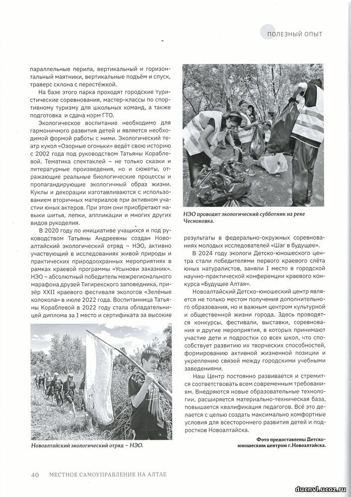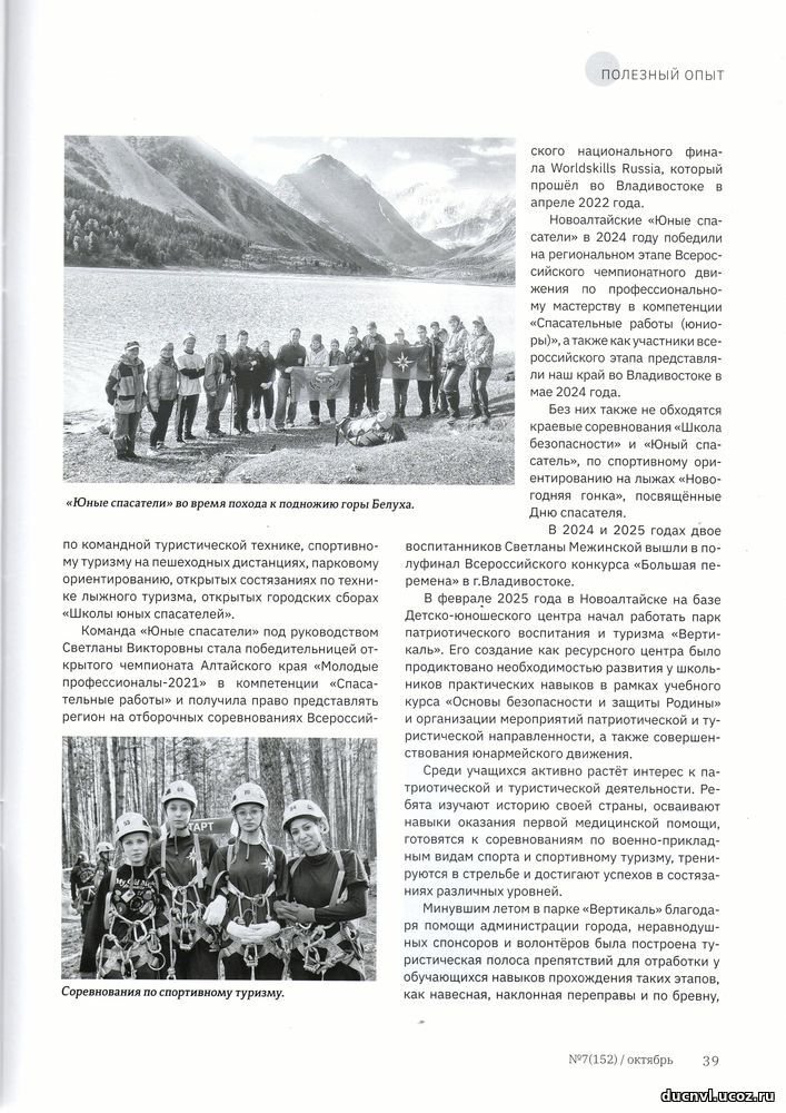 В свет вышел новый выпуск краевого информационно-аналитического журнала «Местное самоуправление на Алтае». Этот авторитетный источник, учрежденный правительством Алтайского края, краевым Законодательным Собранием и Ассоциацией «Совет муниципальных образований Алтайского края», традиционно освещает актуальные общественно-политические вопросы региона. В седьмом номере особого внимания заслуживает раздел «Полезный опыт», где представлена статья Татьяны Витальевны Страшниковой, директора МБОУ ДО ДЮЦ - «Уникальное пространство для развития». В своей публикации директор делится вдохновляющей историей о выдающихся успехах объединений Детско-юношеского центра, демонстрируя яркий пример эффективной работы с подрастающим поколением.